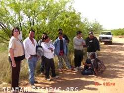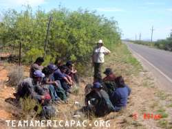 This afternoon Kathy and I checked out a lay-up area that is frequently used by smugglers. We encountered eight illegal aliens waiting for their pickup. I had circled around behind the main waiting area and surprised them. The other picture is after we had brought them out to the road and were waiting for the border patrol.