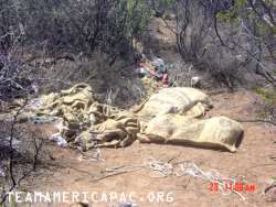 We took this photo last summer in August 2003. We (Kathy and about 6 friends) were monitoring a well-used human smuggling trail about 5 miles west of Naco, Arizona and about 1.2 miles north of the border.